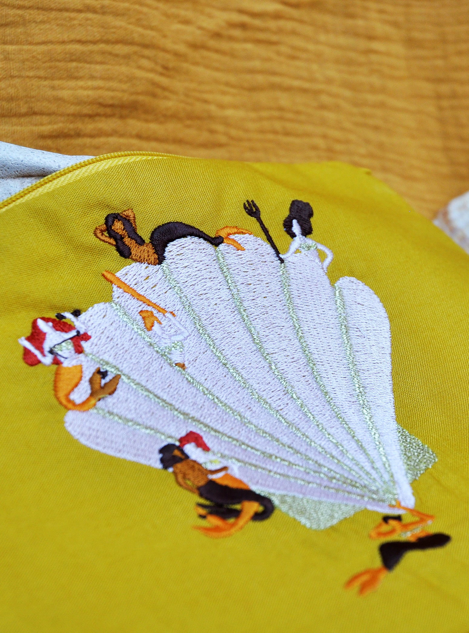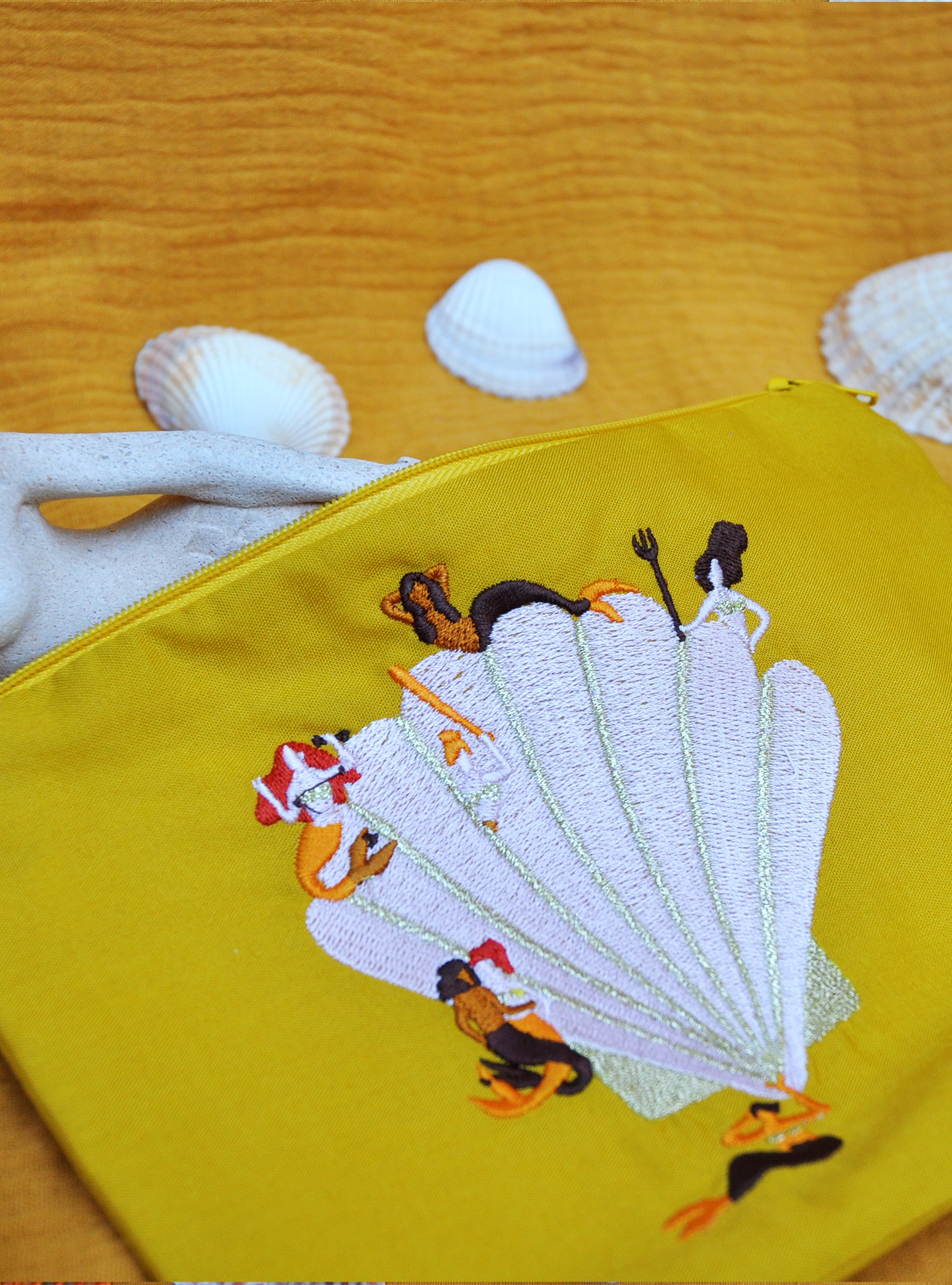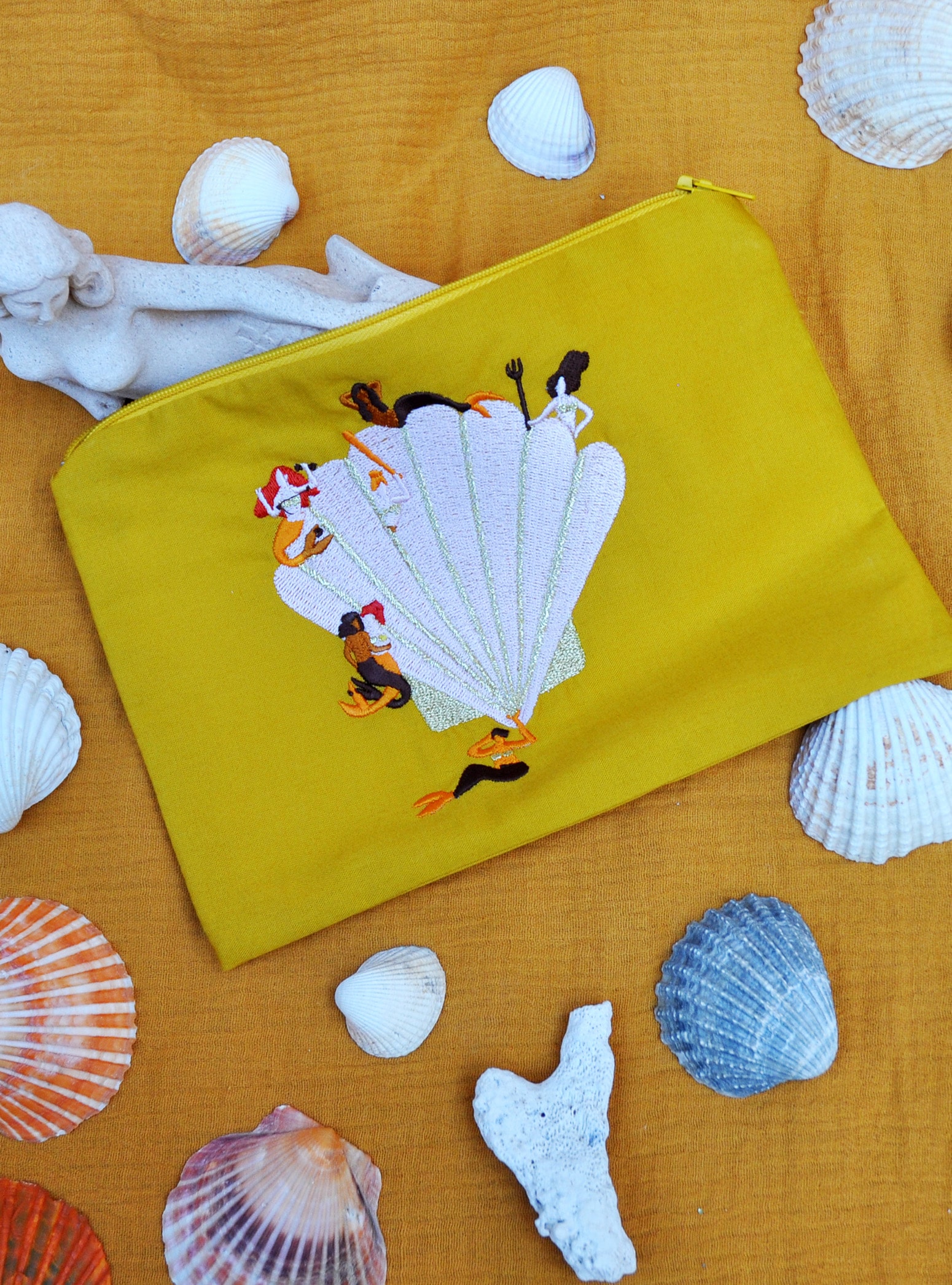 Trousse de voyage en coton Biologique certifié Gots, doublée. La trousse mesure 20x14cm et l’illustration brodée au centre fait 10 x 12 cm.
