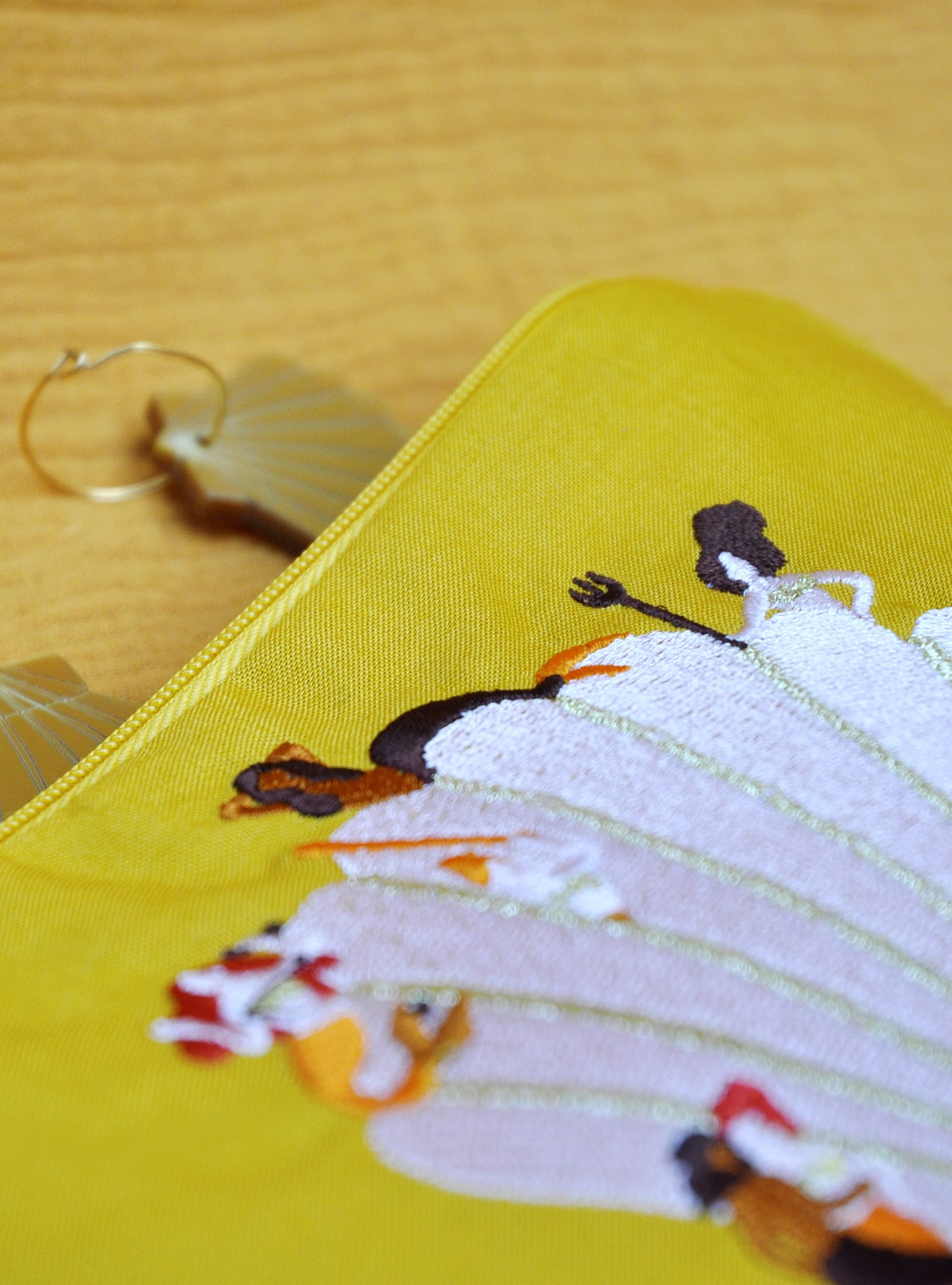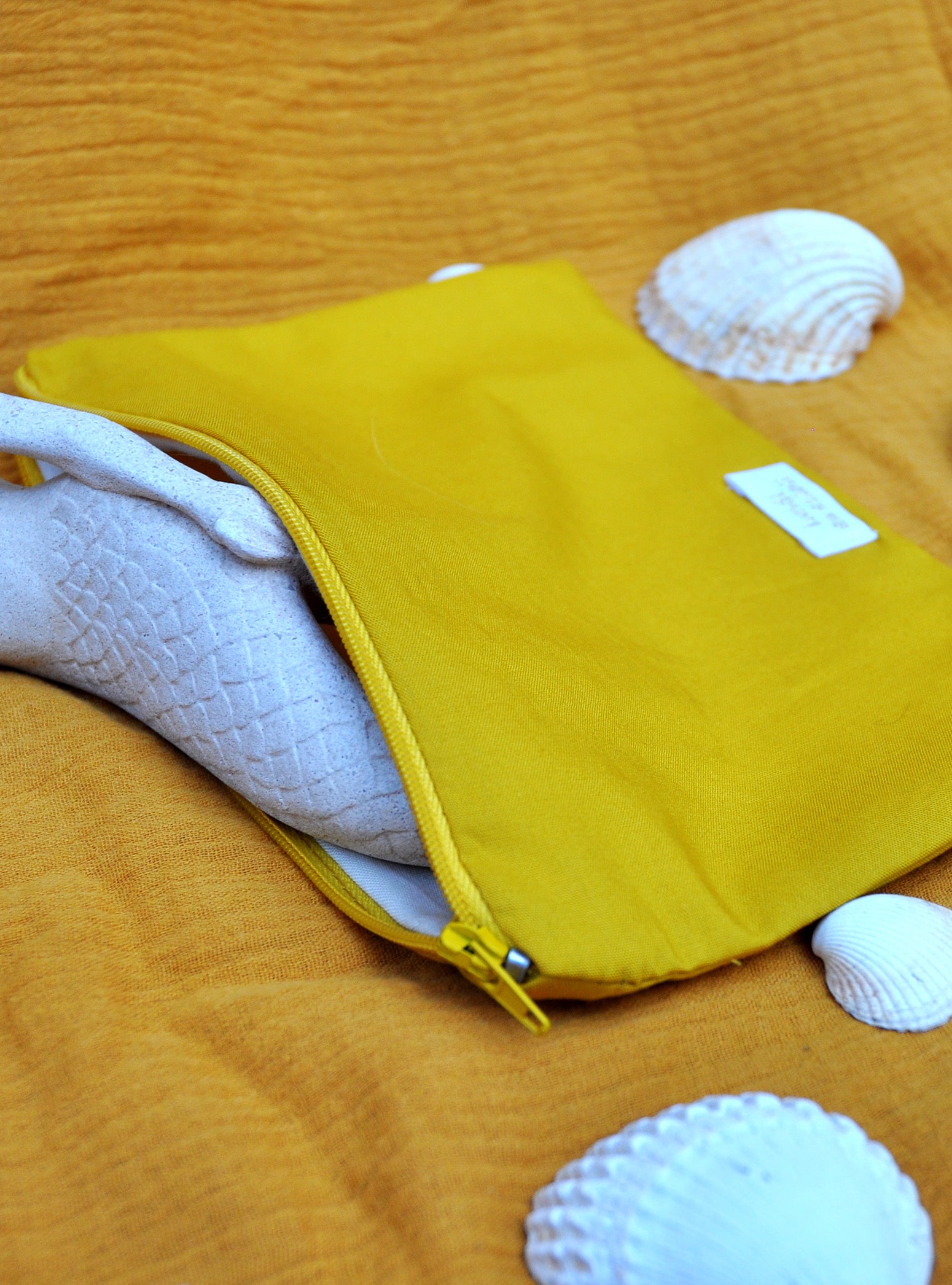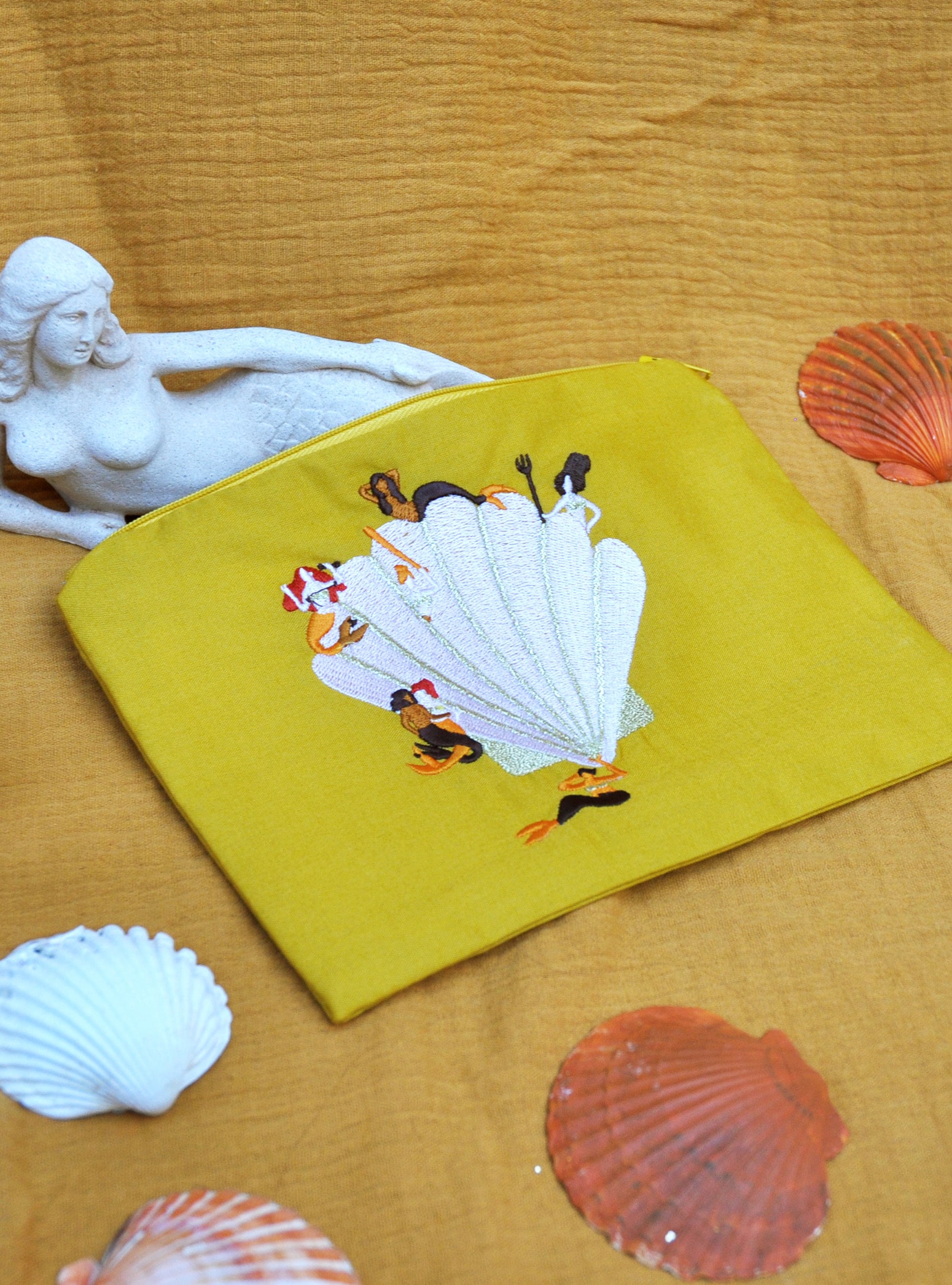 Trousse de voyage en coton Biologique certifié Gots, doublée. La trousse mesure 20x14cm et l’illustration brodée au centre fait 10 x 12 cm.