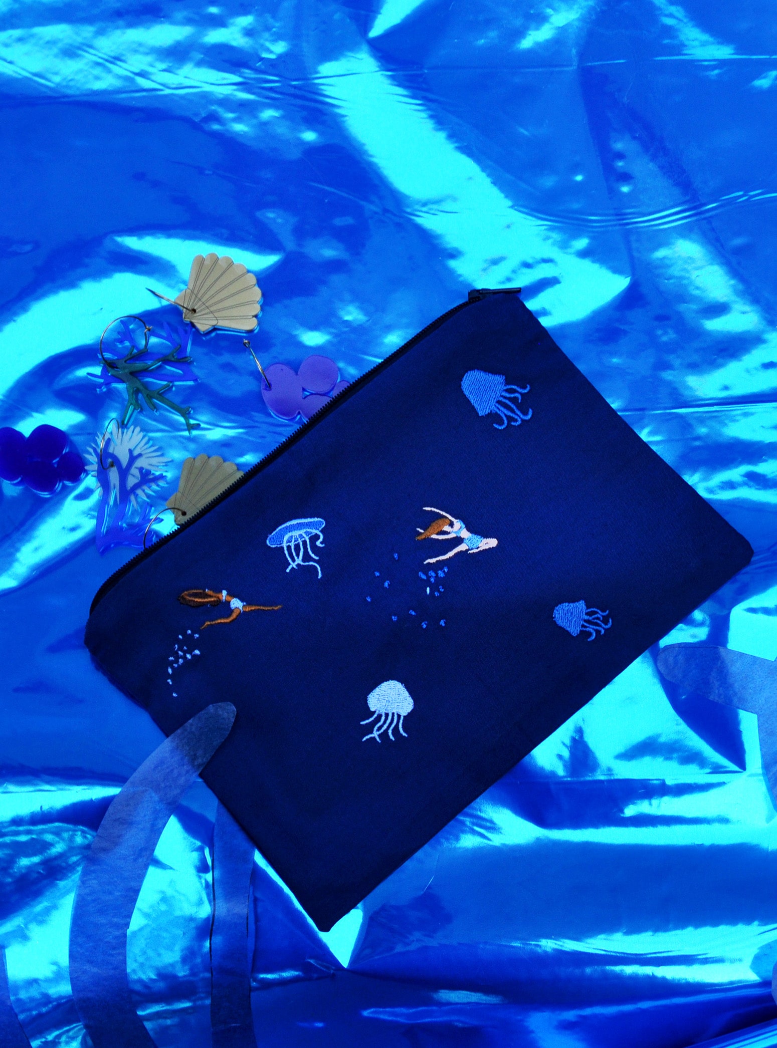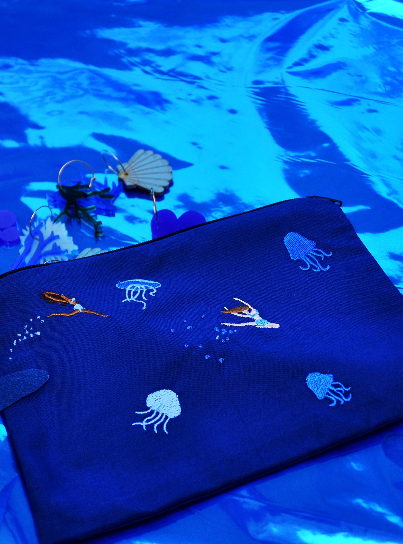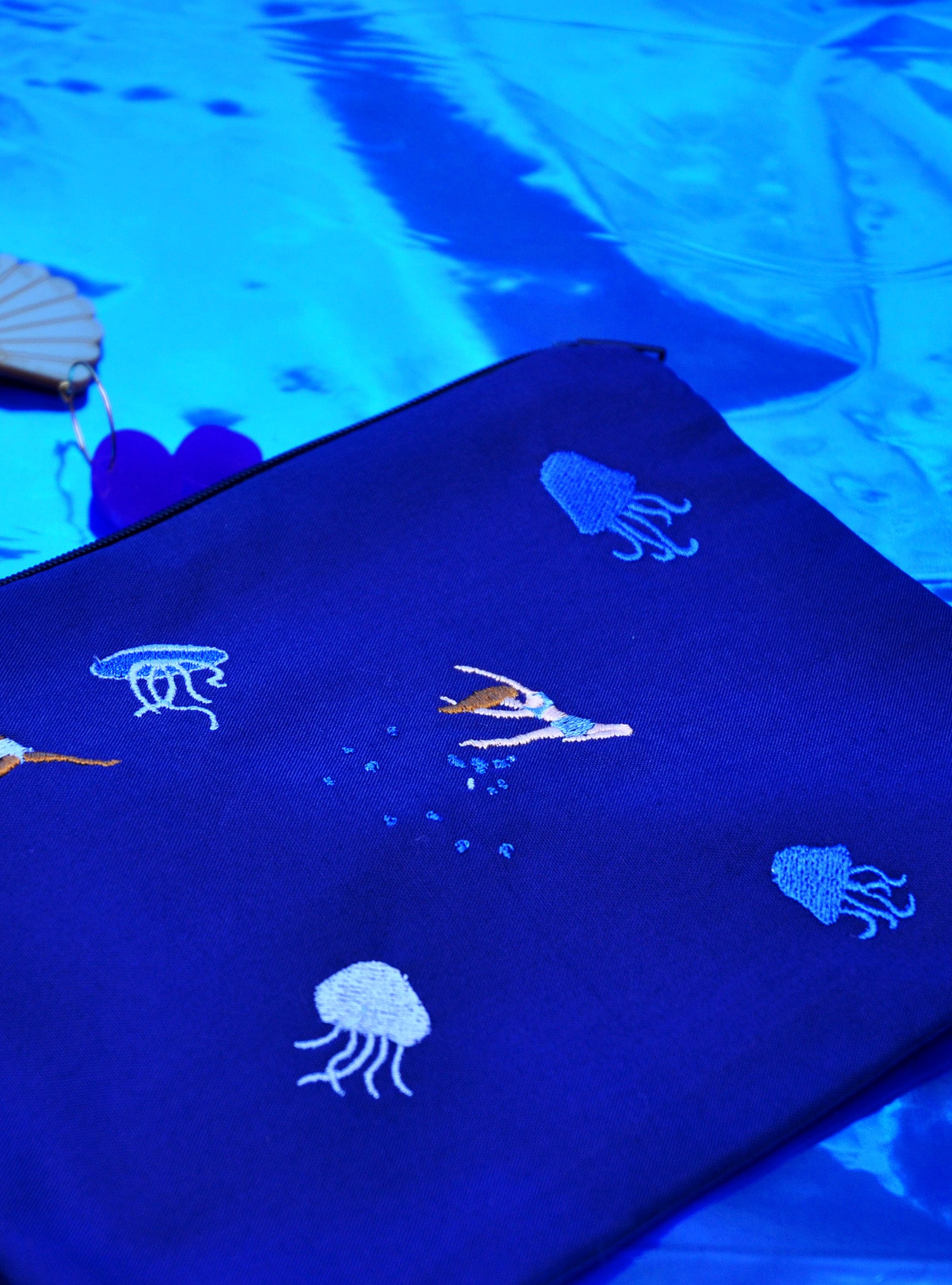 Trousse de voyage en coton Biologique certifié Gots, doublée. La trousse mesure 20x14cm et l’illustration brodée au centre fait 10 x 17 cm.