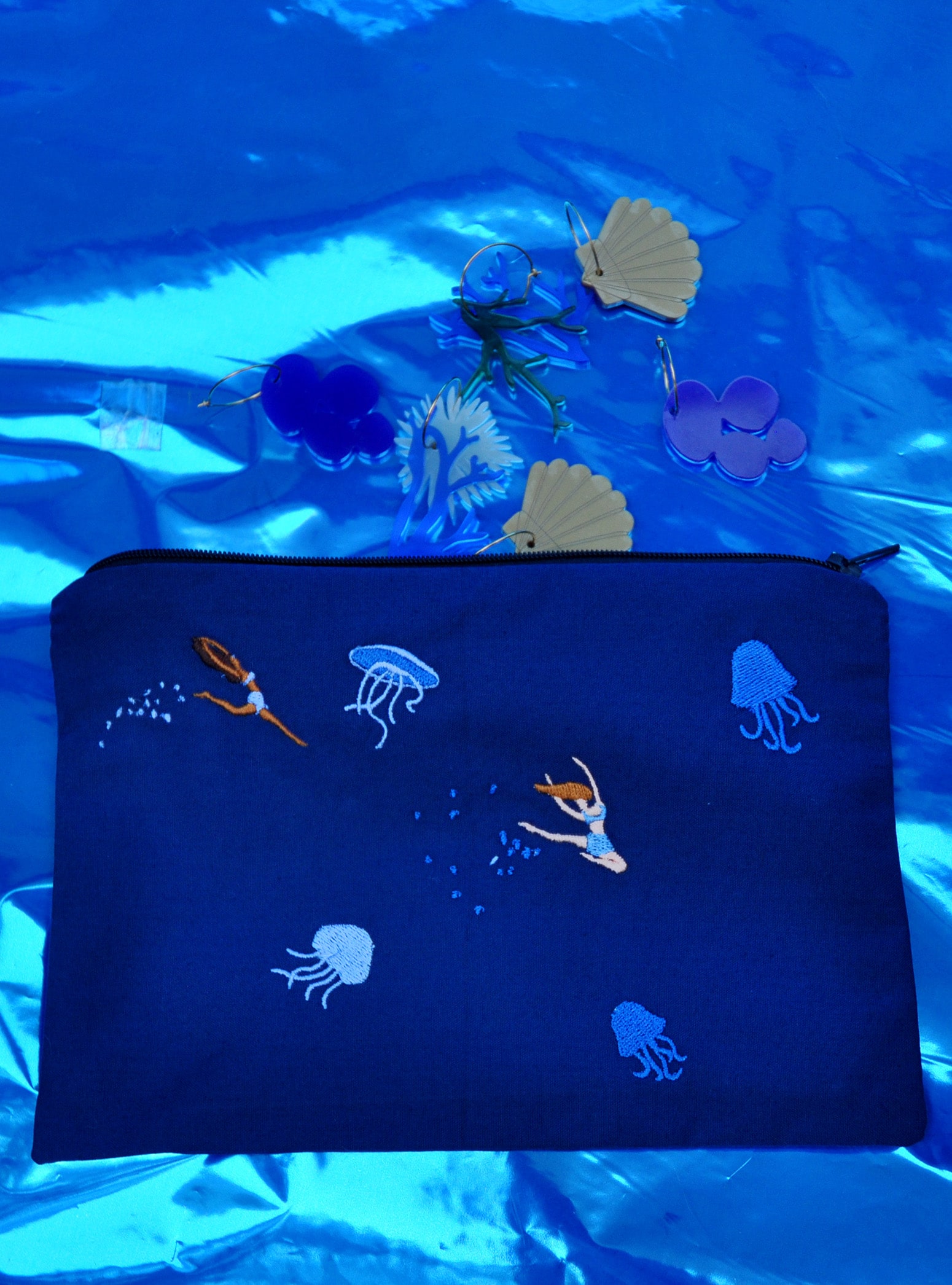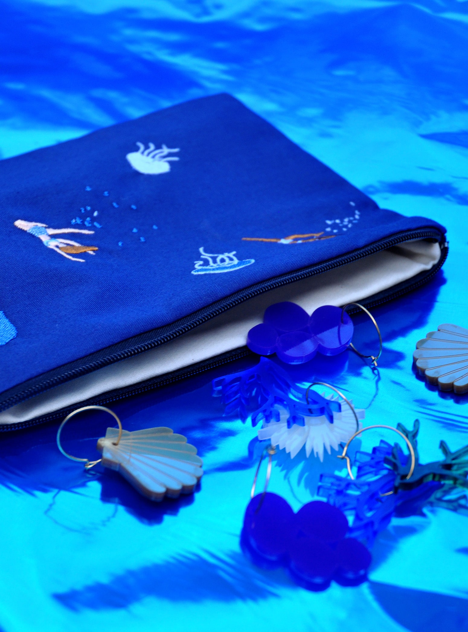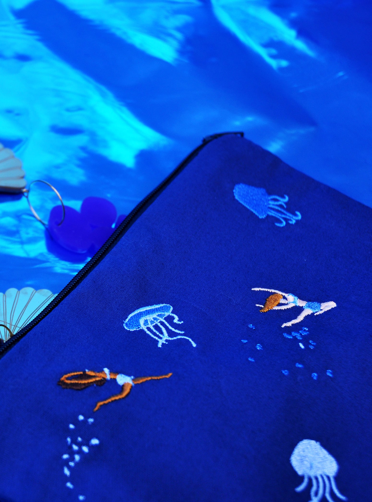 Trousse de voyage en coton Biologique certifié Gots, doublée. La trousse mesure 20x14cm et l’illustration brodée au centre fait 10 x 17 cm.